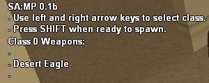 Окно информации о классе это специальное окно, которое появляется, когда вы находись на экране выбора класса. Оно дает детальную информацию о классе, который вы в данный момент смотрите на экране, такую как, оружие, имеющееся у класса и номер модели. Это окно также дает сведения о версии SA:MP - на скриншоте 0.1b.