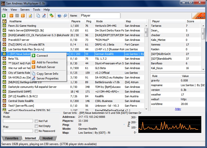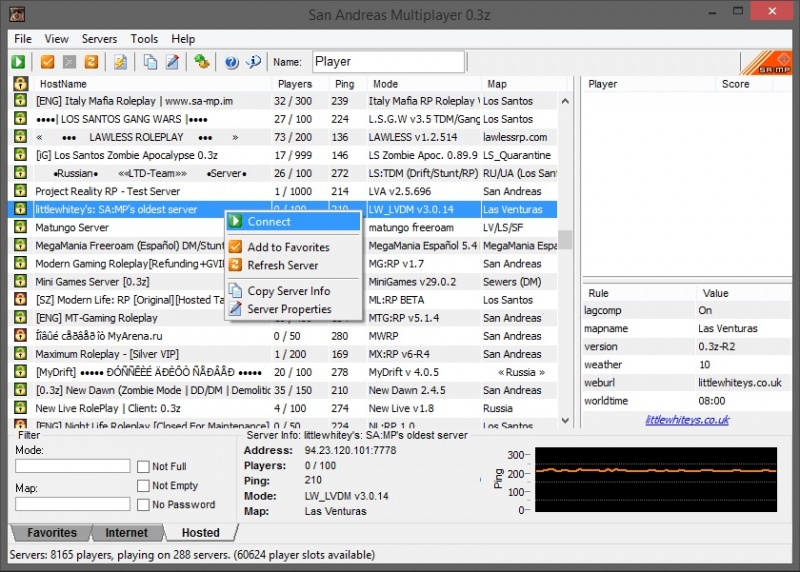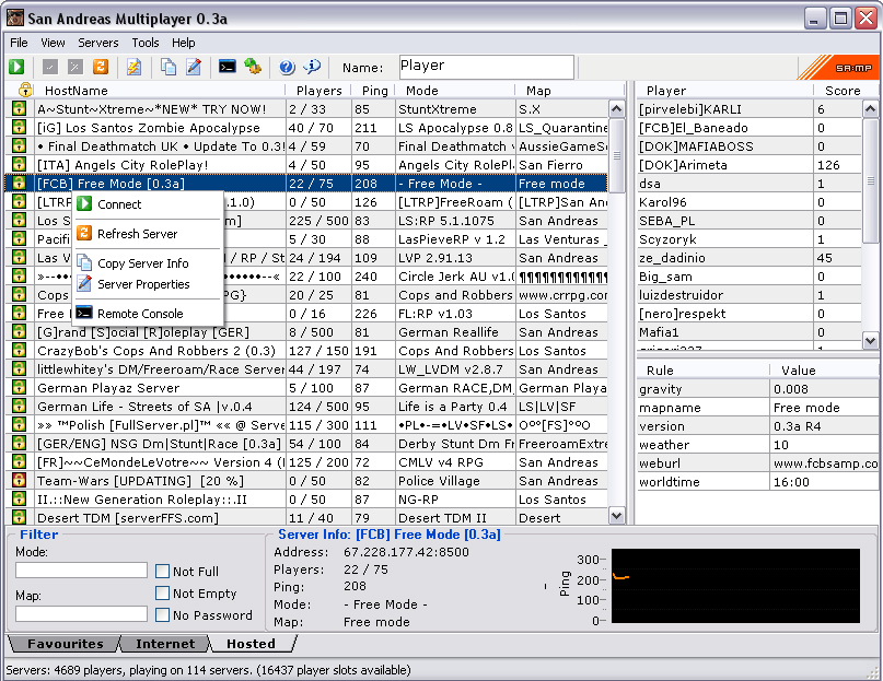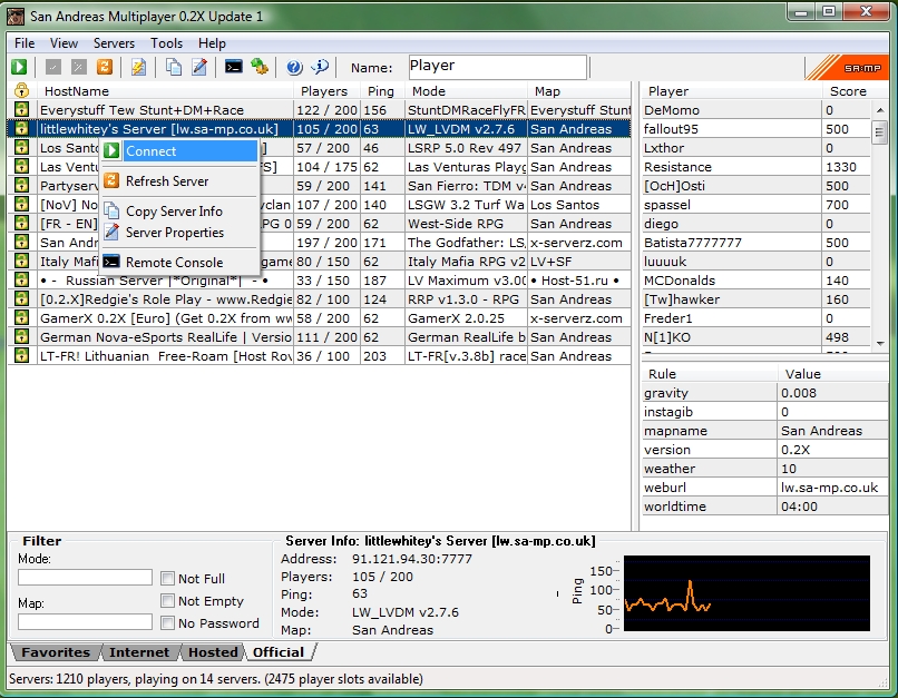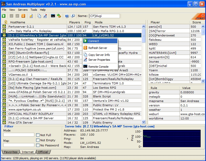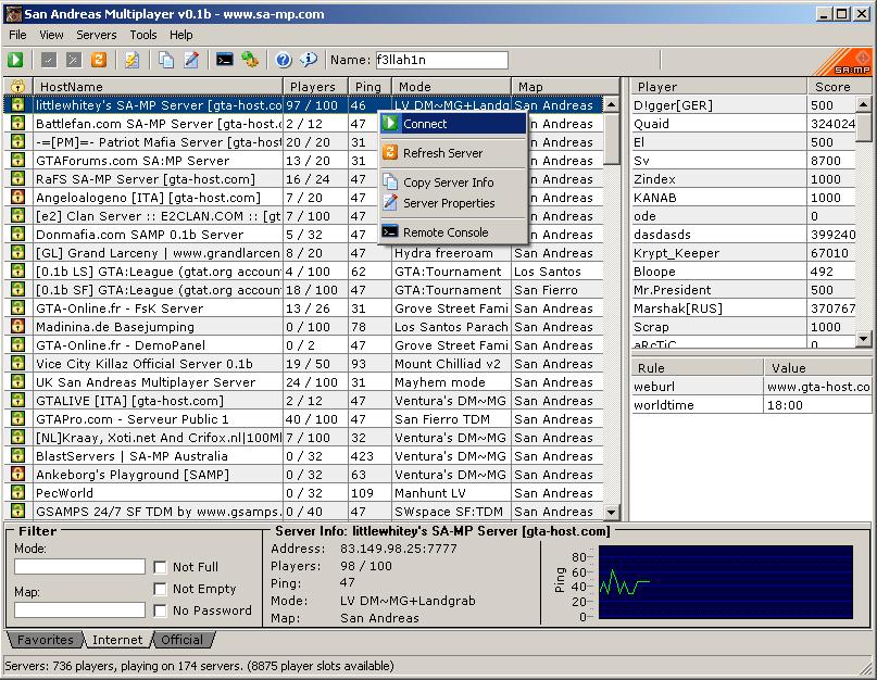 - (del) (rev) 21:23, 24 May 2006 . . F3llah1n (Talk) . . 807x626 (164606 bytes) (A screenshot showing the browser window of SA:MP with littlewhitey's popular 100 player selected.)