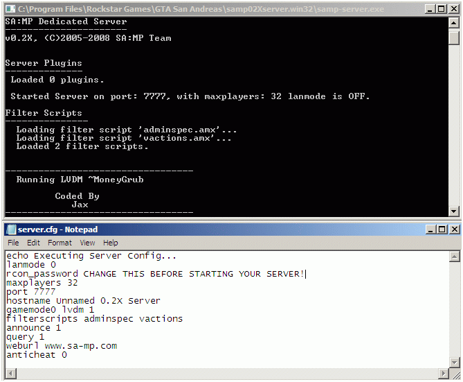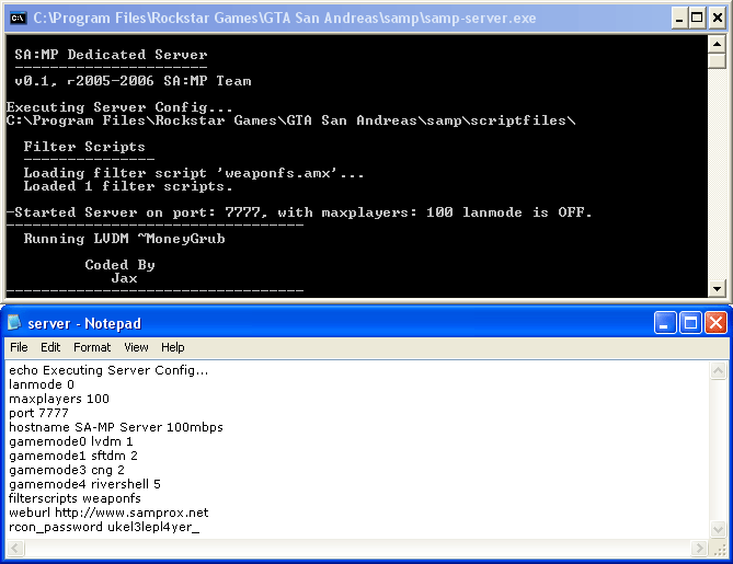 - (del) (rev) 13:33, 27 May 2006 . . Simon (Talk) . . 669x515 (20414 bytes) (A successful server execution next to the server.cfg that made it work.)